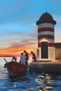 Barkajol depicts a quiet moment of transition at dusk — figures boarding a small boat beside a lighthouse as daylight fades.