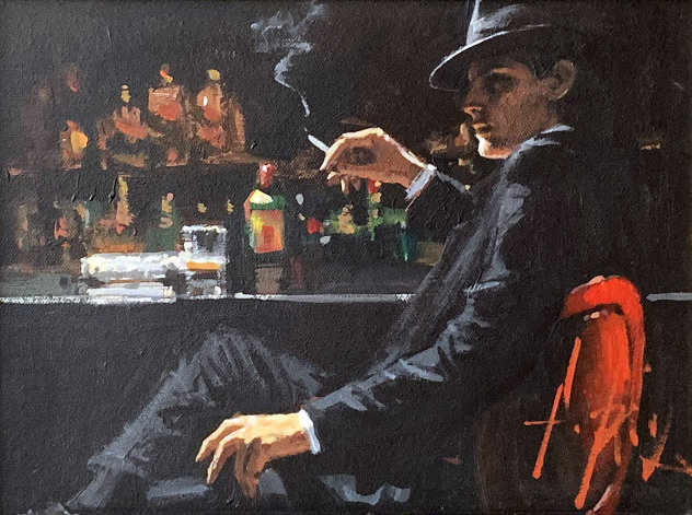 Fabian Perez’s paintings are immediately recognizable for their dramatic use of light and shadow, rich color palettes, and emotionally charged subjects. His work is often described as cinematic, with each painting resembling a scene from a classic film noir. The figures in his paintings—often solitary women, couples in passionate embrace, or men exuding a brooding intensity—are portrayed in moments of introspection, desire, or contemplation.