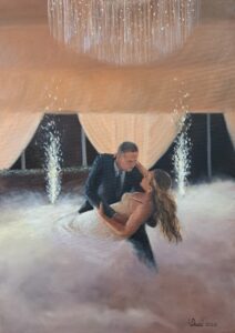 Live wedding painting is the creation of an original artwork during your wedding — a piece that captures mood, presence, and connection. Guests can observe the painting as it unfolds, and after the event I complete it in my studio to achieve a refined, lasting result.